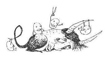 – Раз, два... – а сам между тем рога привинчивает. – Три, четыре... – а сам подушку на пробу бодает. – Пять, шесть... – тут бада покрался к двери... – Тише! – вдруг сказал зок Мю-одов, – бада же спит. И все затихли.