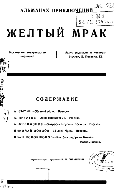 Новый выпуск серии «Polaris» представляет собой факсимильное переиздание редкого приключенческого альманаха «Желтый мрак», впервые увидевшего свет в 1927 г. В книге читатель найдет рассказы и повести о Гражданской войне, воспоминания о пленении адмирала Колчака и авантюрный рассказ А. Филимонова «Хитрость Иеремии Поккера». Особый интерес представляет остросюжетная повесть А. Сытина, давшая название альманаху и рассказывающая о контрабандистах и торговцах опиумом в Средней Азии.