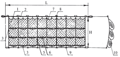 Рис. 3. Рамовая сеть (трехрамовая): 1 – сетное полотно; 2 – верхняя подбора; 3 – нижняя подбора; 4 – боковая подбора (пожилина); 5, 6 – режа; 7 – посадочная нить; 8 – поплавок; 9 – грузило; 10 – сетной мешок (карман)
