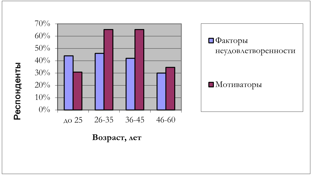 Рисунок 6. Зависимость факторов удовлетворенности и неудовлетворенности от возраста сотрудников отделения банка.