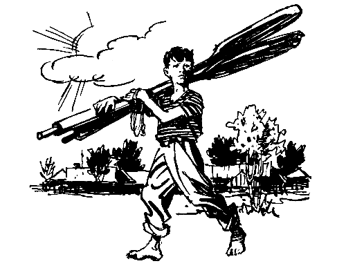Верхушка липы еще качалась, а мальчик уже выбежал из калитки, держа на плече весла, а в руке «дорожку» — длинный шнур с верткой золотистой блесной и рыболовным крючком.
