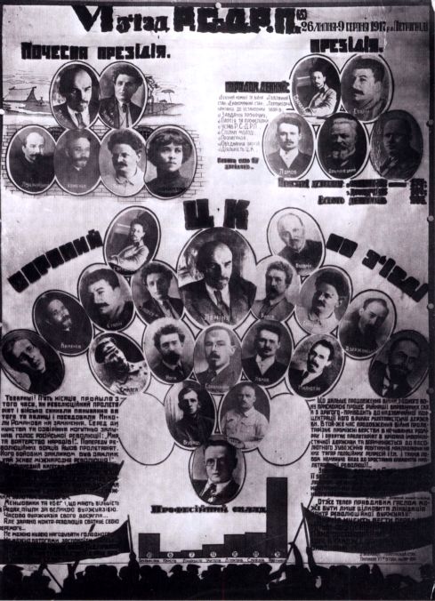 Фотомонтаж. VI съезд РСДРП(б) 26 февраля — 3 августа 1917 г. (на украинском языке): Зиновьев, Рыков, Троцкий, Милютин, Бухарин, Каменев, Иоффе. г. Петроград, 1917