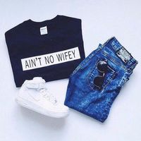Натянула чёрную толстовку с надписью: "AIN'T NO WIFEY"(пер. Не Женушка), синие потёртые джинсы с завышенной талией, белые кросы "Nike" и чёрные очки. Беру белый рюкзак с интересными рисуночками и складываю туда: блокнот с ручкой, бутылочку с минералкой, конфеты мишки гамми и мятную жвачку, телефон и наушники.