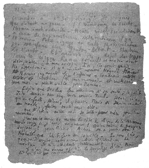 Надеюсь, Денден [Дениза] будет беречь себя; малышу Жито [Житомиру — так Дениза Берр в шутку называла своего еще не родившегося ребенка, возможно, в честь наступления советских войск под Житомиром] будет хорошо у кузена Поля [у акушерки в Аржевиле]. У Анри [Реймона Берра] с собой только одна дочь Элен, она ему дорога. Но если появится на свет [родит] Дениза, сделайте все для нее.