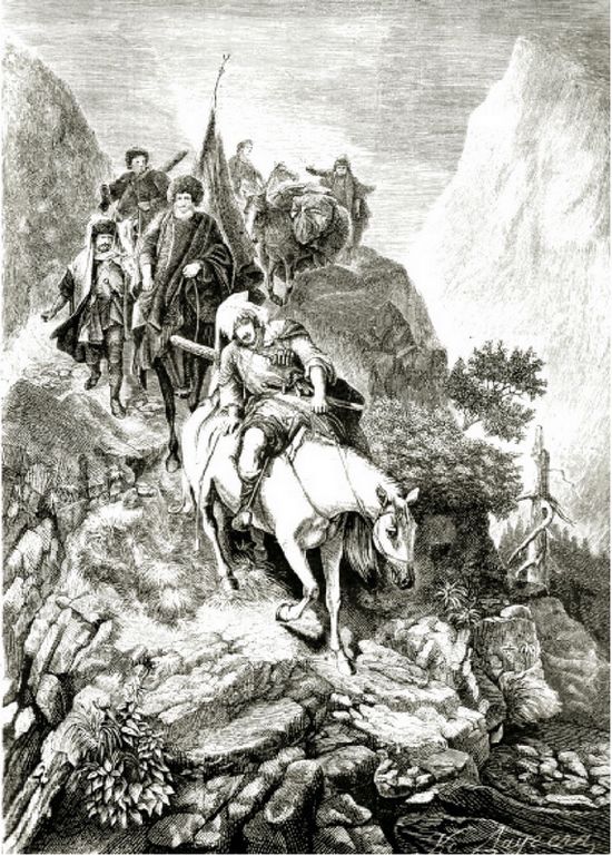 Так и сделали. Горцы, до этого никогда не слышавшие громогласной музыки (а легко представить, как она громыхала в узком ущелье!), были ошарашены. И природное их любопытство оказалось сильнее враждебности — они с интересом взирали на происходящее внизу, в ущелье. А казаки тем временем прошли самый опасный участок.