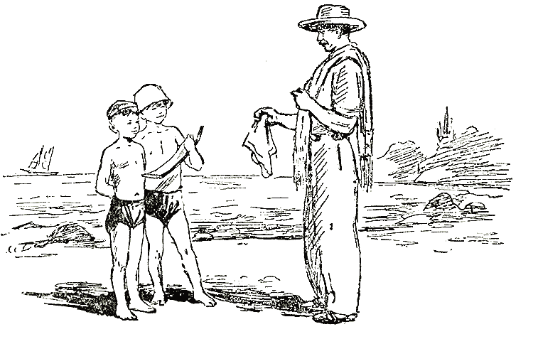 Им интересно было смотреть, как далеко, далеко на волнах появлялось светлое пятнышко. Оно быстро приближалось к берегу, становилось всё больше… И вот уже видны были широкие трубы, белые палубы и весь пароход. Он причаливал к пристани, а за ним долго оставался след — длинный и блестящий, как лента.