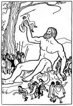 Много их возилось около героя на земле — им понравился лук Геракла, и они собирались утащить его. Геракл стал ловить их, связывая за руки, за ноги, потом нанизал на длинную палку и понёс в Лидию.