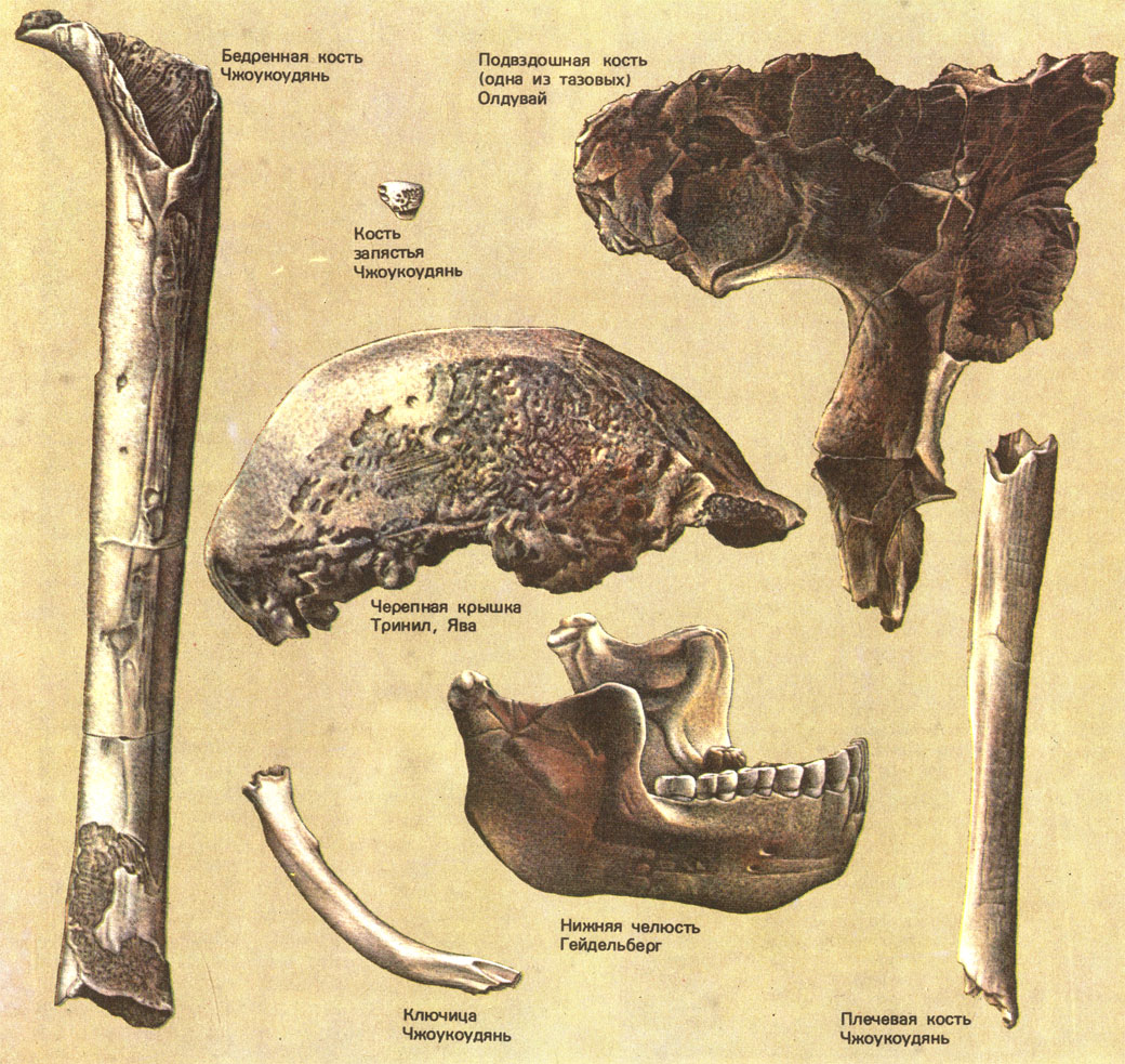 Каков же был человек, 400 тысяч лет назад оставивший следы своего пребывания в этой бухте на побережье Европы? Кто он был? Хотя он являлся в эту бухту каждую весну на протяжении многих лет, среди найденных там окаменелостей нет никаких человеческих костей - ничего, непосредственно связанного с человеком, кроме единственного отпечатка стопы в плотном песке. К счастью, найдены и другие стоянки примерно той же древности, где, кроме сходных орудий, костей животных, а в двух случаях и очагов, были обнаружены окаменевшие кости этого доисторического человека. Взятые в совокупности, эти археологические находки создают удивительно полную картину, позволяющую узнать не только, как выглядел этот человек, но и откуда он пришел. В некоторых отношениях ученые, располагая теми преимуществами, которые заложены в ретроспективных оценках, вероятно, знают о нем больше, чем знал о себе он сам.