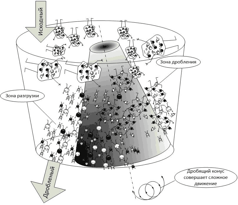 Дробилка состоит (рис. 1.1) из дробящего конуса, совершающего сложное движение, наподобие полета Земли вокруг Солнца и неподвижного внешнего конуса. В месте, где дробящий конус приближается к неподвижному происходит сжатие материала и его последующее разрушение, на противоположной стороне – выгрузка уже дробленного продукта.