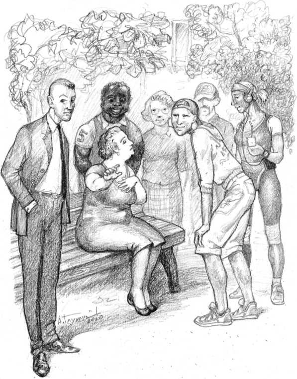 В одном из них стояла группа людей. Смутное подозрение заставило меня подбежать к ним. Все они смотрели на скамейку, где сидела… моя тёща и что-то громко рассказывала всем.