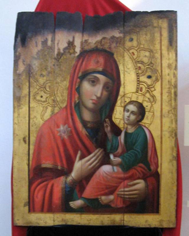 Обгоревшая икона Богородица Одигитрия, найденная среди руин Успенского собора