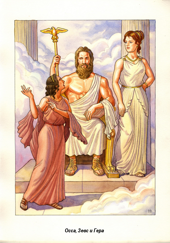 Гера, сохраняя гордый и надменный вид, развернулась и вышла прочь. Зевс же пустился в долгий разговор с Оссой, которая была счастлива поведать Громовержцу огромное количество правдивейших историй обо всём, что произошло за последнее время на белом свете.