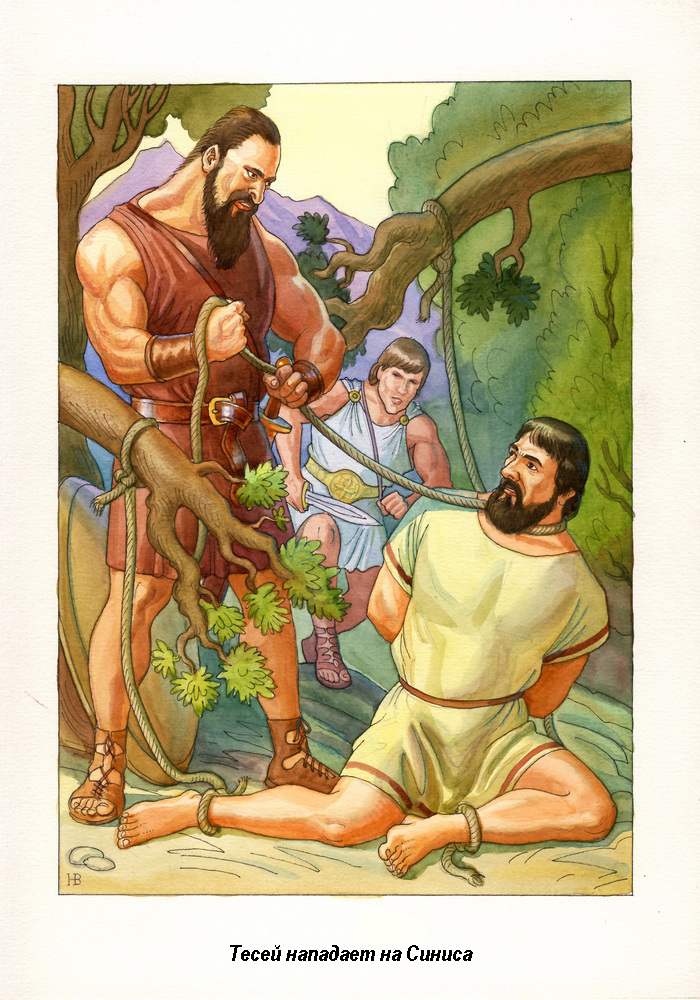 – Ну что, готов полетать по небесам?– спросил Тесей и, не дожидаясь ответа, перерубил верёвку, удерживавшую вершины сосен в согнутом состоянии. Деревья тут же распрямились, взметнувшись ввысь, и разорвали на куски тело Синиса. Так этот негодяй получил, наконец, по заслугам за все свои злодеяния, которые он творил на протяжении нескольких лет, безнаказанно нападая на людей и убивая их самым жестоким образом.