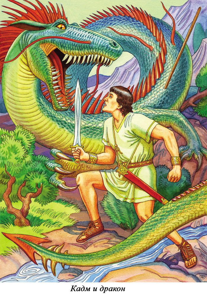 Чудовище бросилось на Кадма, с хрустом сметая на своём пути небольшие деревья. Финикиец начал отходить назад, делая выпады мечом и ловко уклоняясь от ужасной пасти, из которой в несколько рядов торчали острые, как кинжалы, зубы. Дракон отяжелел от обильной трапезы, да и копьё, застрявшее в спине, причиняло боль и мешало двигаться, поэтому он перемещался хаотическими бросками.