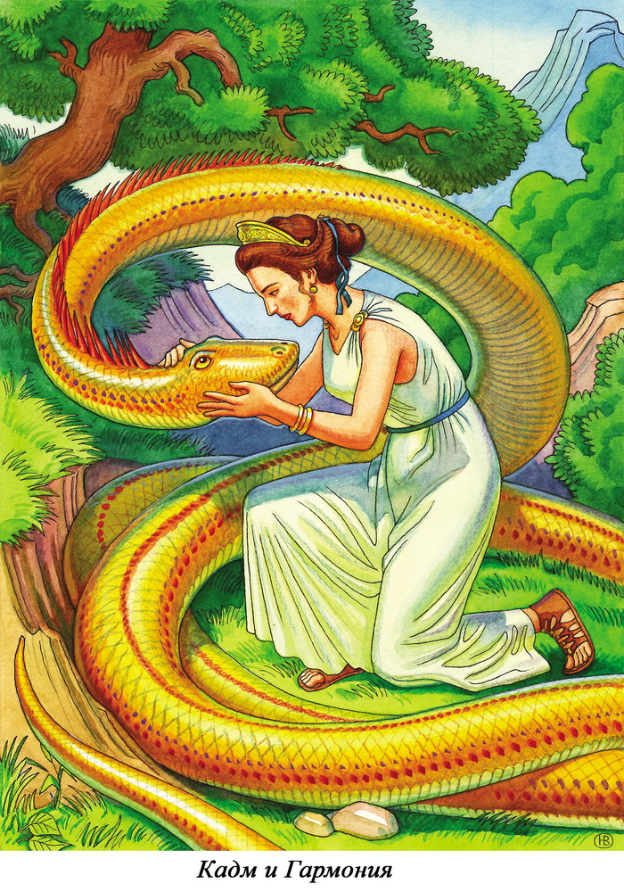 И вот уже то не Кадм был, а огромный золотистый змей с изумрудными глазами. Он вился кольцами около Гармонии. Гармония в отчаянии обхватила змея руками и принялась целовать его. Слезы лились из её глаз и капали на чешую змея, который тоже льнул к плачущей женщине и будто пытался что-то сказать.