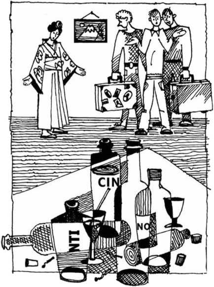 Что же такое экстраординарное случилось с нашими танцовщиками прославленного балета? История умалчивает о характере почти «напольного» застолья, а также о качестве и количестве потребленных напитков высокомолекулярного состава (особенно сакэ — традиционного местного алкогольного напитка 20-45°, получаемого путем сбраживания риса), но зато достоверно известно, что обивка ценного декоративного дивана, из-за неосторожно брошенной сигареты, пришла в совершеннейшую негодность. Обретшие через несколько часов ясность сознания поклонники Терпсихоры, узрев содеянное, пришли в ужас: хотя и малоформатный, но не лишенный изысканности диван, украшенный ковкой, лакировкой и изготовленный из ценной породы дерева (то ли тика, то ли хиноки), являл собой страшное зрелище, гарантировавшее немалые финансовые убытки постояльцам отеля. Возникла непредвиденная головоломная ситуация, а возмещать убытки, естественно, никто не хотел.