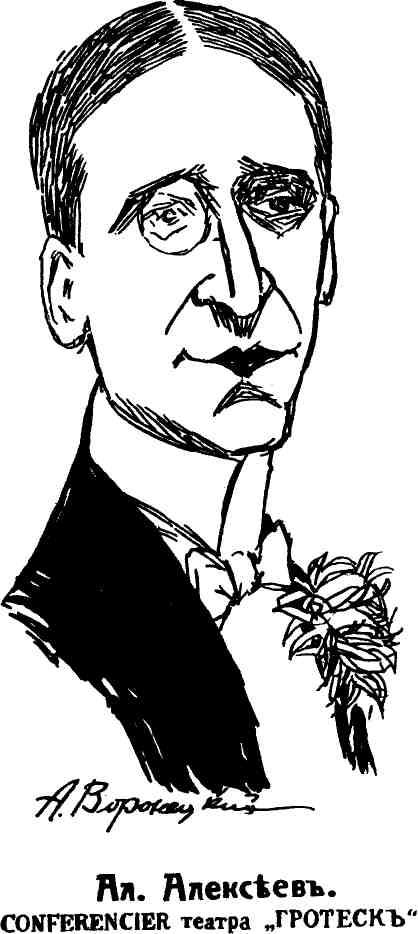 «Pavillon de Paris». 1917 год. Шарж Пьеро-О. С большим носом — я, слева — дуэт Джонсон, справа — Ртищева.