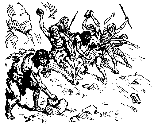 На каменной площадке перед пещерами раздались громкие крики. Маумы подбегали к обрыву и, возбужденно жестикулируя, указывали в степь. Зей и Корру тоже вскочили и увидели в высокой траве рыжеватые спины антилоп сайгаков. Но конечно, не эти безобидные животные, которые сами нередко становились добычей маумов, вызвали переполох. ВскореКоррузаметил неподалеку от стада пещерного льва. Хищник крался против ветра, приближаясь к ничего не подозревавшим сайгакам. Еще миг — и в руках Корру оказался большой камень. Никто в становище остророгих туров не метал так далеко и с такой меткостью камни, как умел это делать Корру своими длинными руками. И на этот раз горбатый охотник не промахнулся. Лев с яростным ревом вскочил на задние лапы. Испуганное стадо сайгаков умчалось в степь. Взбешенный неудачей хищник повернул к скалам. Град камней встретил льва, и он короткими скачками умчался в сторону леса. Вслед хищнику понеслось дружное «о-эй!»…
