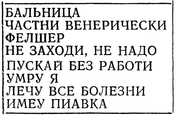 Григор был уверен, что эти неуклюжие слова, от которых несло вином и блевотиной, — одухотворены, живы. Истинная свобода… ХОЧИШ СМАТРИ НИ ХОЧИШ НИ СМАТРИ… Ва!.. Это был гимн его свободы… Свобода, братство, вечность… Хочиш сматри, хочиш не… Вывеска в Шайтан-базаре: [17]