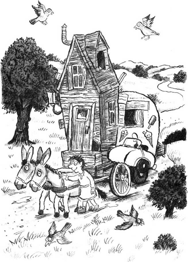 Миссис Ворчунья выбежала из спальни, споткнулась о сына, покатилась кубарем вниз по лестнице, вылетела в дверь фургона и плюхнулась на землю. Ей чудом удалось пронестись мимо колючих зарослей крапивы, однако она въехала носом в земляную кочку у кротовой норы.