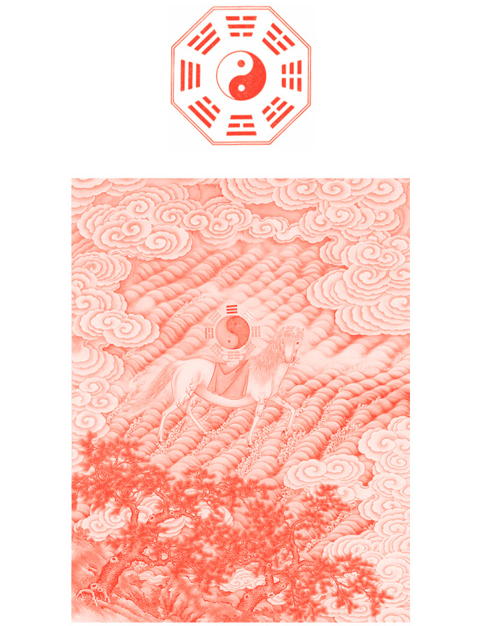 Сверху: Ин, ян и восемь триграмм. Снизу: Небесная лошадь везет инь-ян. Живописный свиток, эпоха Цин.