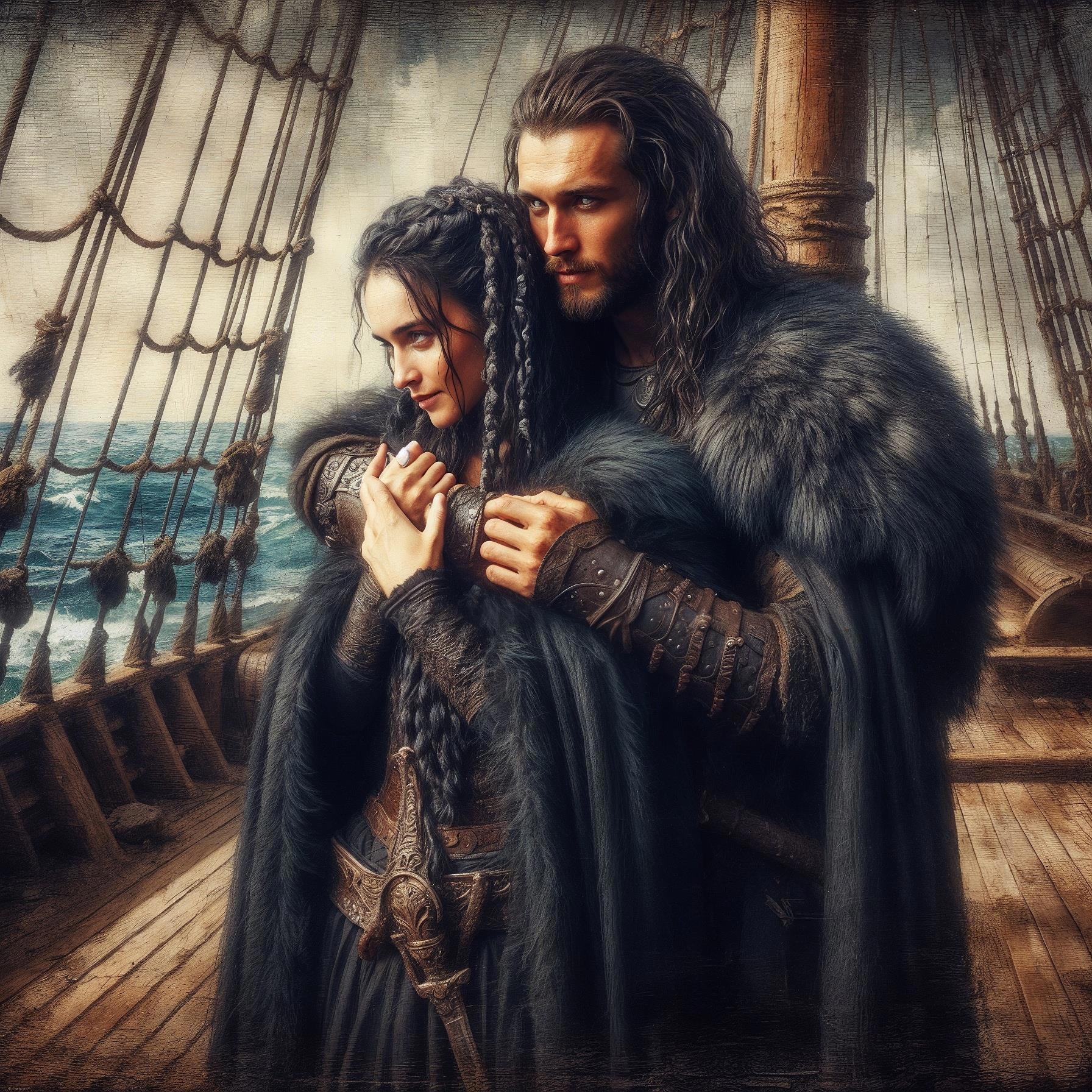 Стоя на палубе корабля, я немного дрожала от холодного ветра. Привыкнув к жаркому солнцу почти круглый год, я совсем отвыкла от пронизывающего ветра северных земель. Но несмотря на это, упрямо стояла, наслаждаясь морским бризом и скрипом досок палубы корабля. "Зря я не прихватила накидку," — прошептала я про себя, пытаясь укрыться от холода. Холодные воздушные потоки проникали сквозь мою одежду, заставляя меня немного дрожать, но я все же упрямо стояла, несмотря на неприятное ощущение. И тут, словно в ответ на мои мысли, мои плечи накрыла теплая ткань, а мужские руки прижали меня к своей сильной груди. Это прикосновение было словно оазисом тепла в суровом морском ветре. Я чувствовала, как тепло распространяется по всему моему телу, согревая и успокаивая.