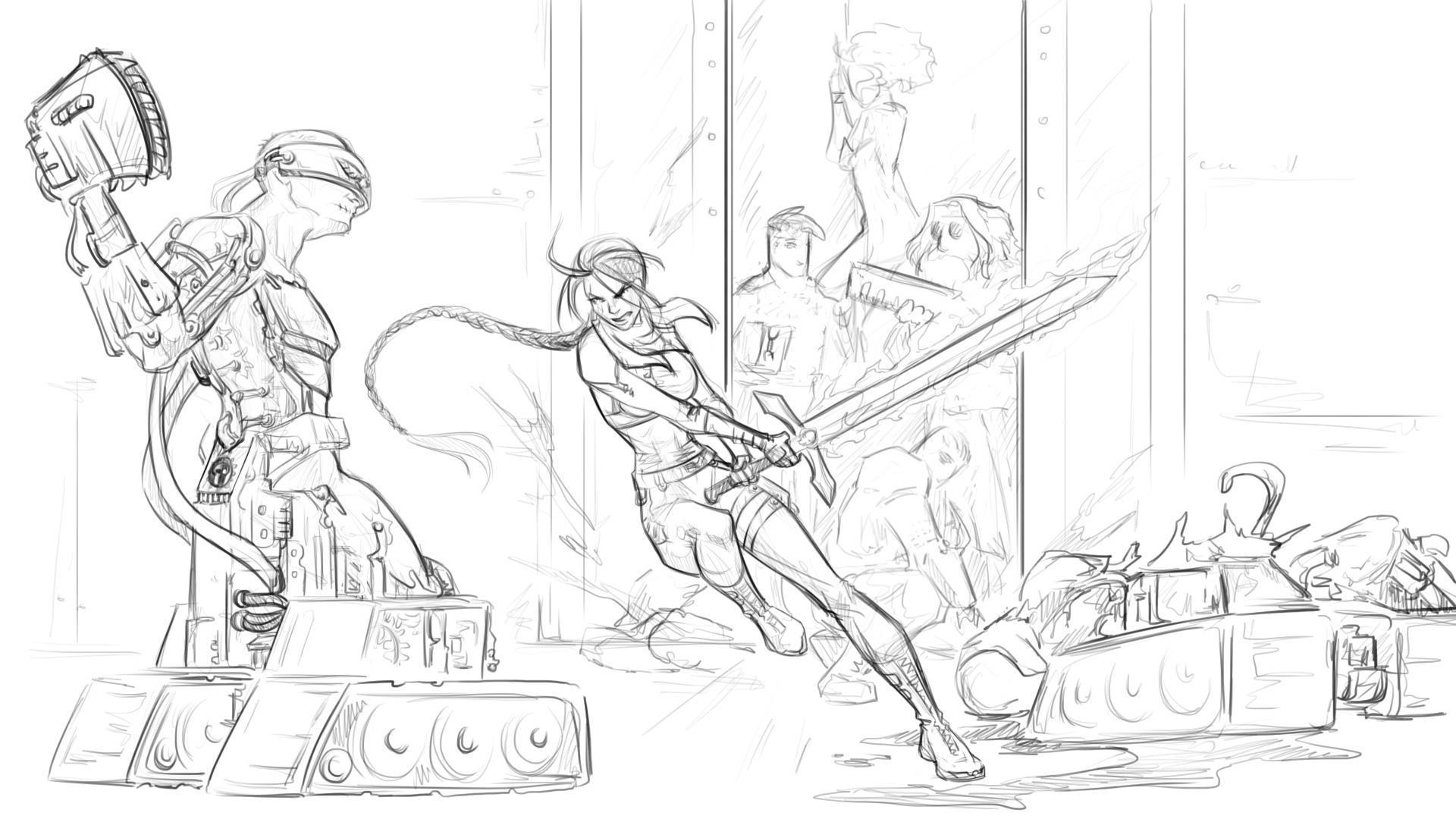 Когда мы достигли дна шахты, коммандер уже рванула в атаку. Сверкнуло поле, отбрасывая пилотопор, горящий синим огнём меч развалил сервитора едва ли не напополам, отрубая вмонтированный в тело болтер. Но тот был все еще жив и только когда меч обратным движением снес ему голову, обмяк, заваливаясь на бок и заливая пол кровью и ядовито-синим хладагентом. Второй ударил топором прямо в голову воительнице, но та, сделав шаг навстречу и чуть в сторону, клинком перевела могучий удар в скользящее касание и немедленно рубанула снизу вверх, вскрывая сервитора как потрошеную рыбу. На пол, в дожде ярко — красной и синей жидкостей посыпались внутренности вперемешку с металлом и массивная фигура обмякла. Пилотопор последний раз с треском высек искры из рокеритового покрытия пола и навсегда остановился.