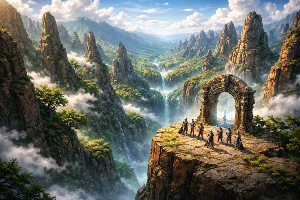 Каменное плато, куда я вошёл, было особенным: посередине возвышались массивные врата с барельефом из монстров и гуманоидных фигур. Именно вокруг них поверхность была усыпана толстым слоем мелкого гравия. Я вышел из ворот и наткнулся на ещё десяток участников: половина людей, половина иных. Они оживлённо обсуждали происходящее.