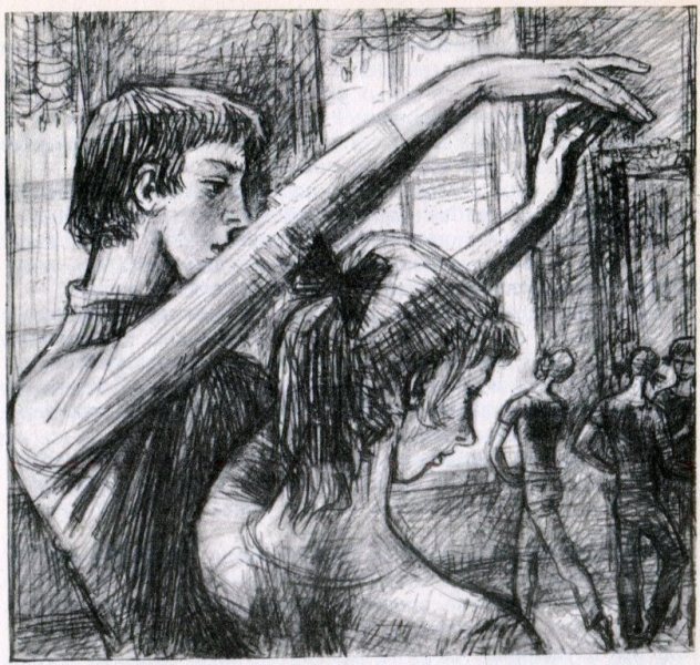 У одной девушки не было партнера. Увидев это, он отделился от стены и как был — в ботинках, пиджаке, школьных брюках с вытянутыми коленями, — так и двинулся к ней через весь зал. Подошел, встал рядом и попытался танцевать со всеми.