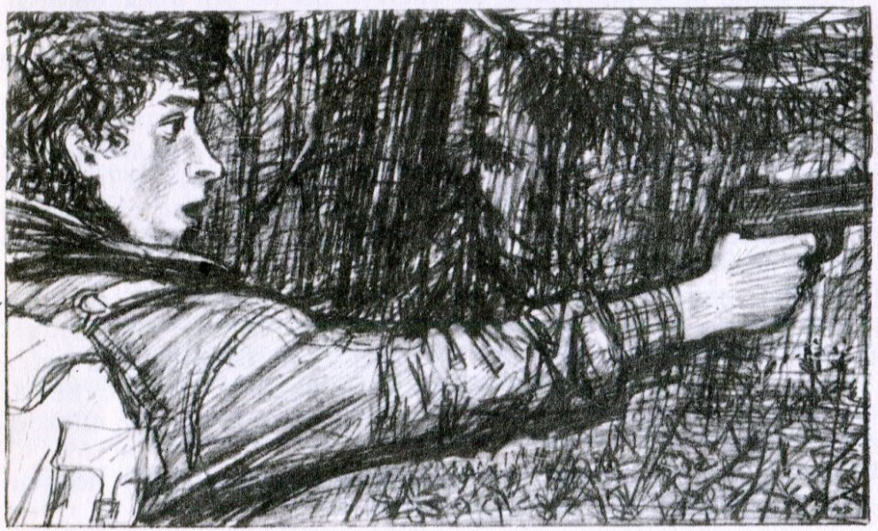 «Сейчас быстро влезу на елку, тогда ничего они со мной не сделают. Буду держать палец на курке, и все. Или вверх стрелять — услышат люди и придут… Они же не просто идут со мной — уводят все глубже в лес… А если стрелять, кто-нибудь обязательно услышит!.. Я должен быть сильнее!»