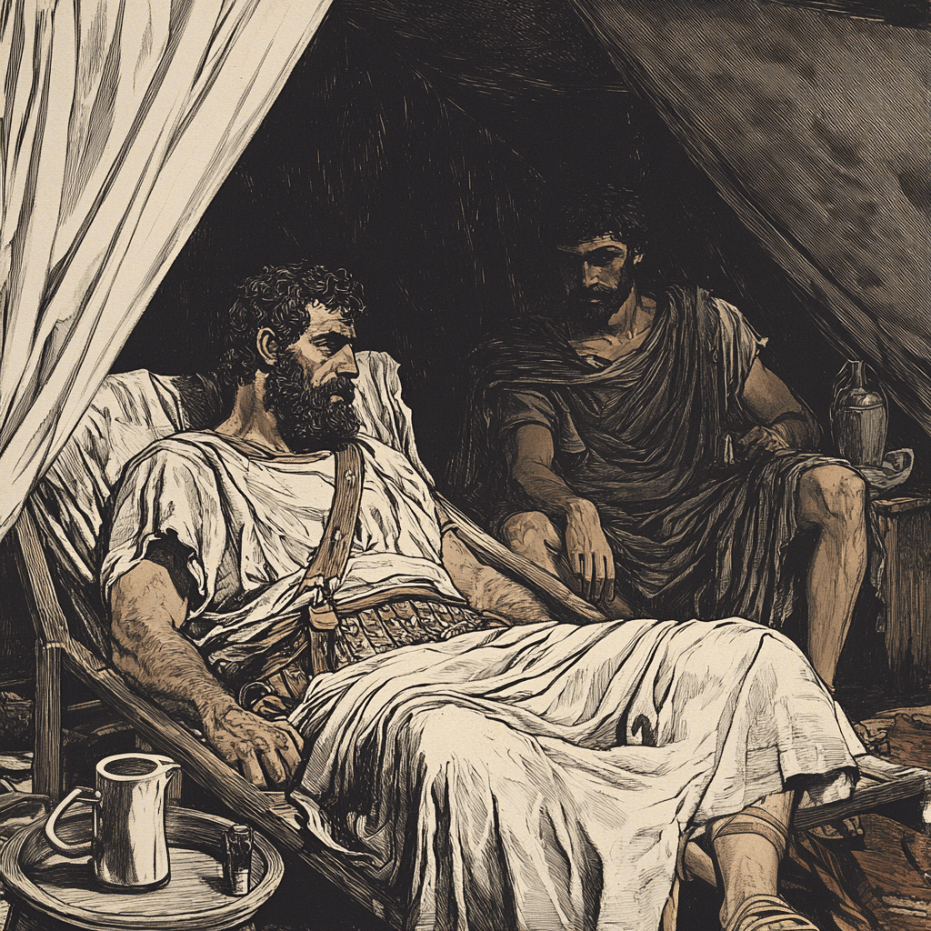 Спендий не слушал его. Он лежал, вытянувшись на спине, и наслаждался отдыхом; рядом с ним стоял большой кувшин с медовой водой, и время от времени он погружал туда голову, чтобы полнее утолить жажду.