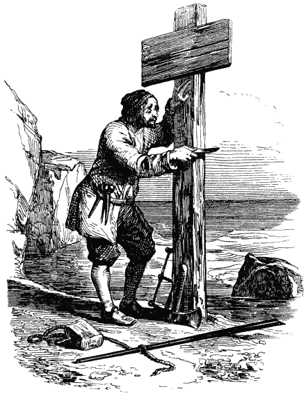 Прошло дней десять – двенадцать моего житья на острове, и я вдруг сообразил, что потеряю счет времени из-за отсутствия книг, перьев и чернил и что в конце концов я даже перестану отличать будни от воскресных дней. Чтобы избежать этого, я водрузил большой деревянный столб на том месте берега, куда меня выбросило море, и вырезал на доске ножом крупными буквами надпись: «Здесь я ступил на берег 30 сентября 1659 года», которую прибил накрест к столбу. По сторонам этого столба я каждый день делал ножом зарубку, а через каждые шесть зарубок делал одну подлиннее: это означало воскресенье; зарубки же, обозначавшие первое число каждого месяца, я делал еще длиннее. Таким образом я вел мой календарь, отмечая дни, недели, месяцы и годы.