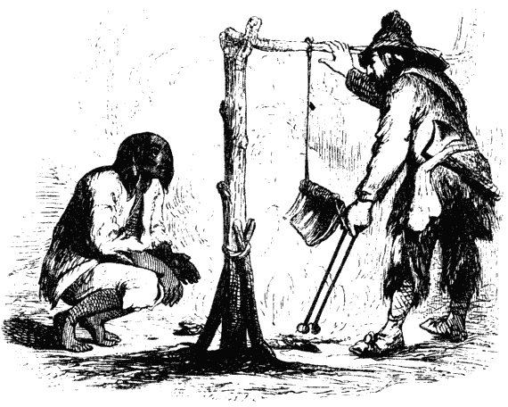 Накормив таким образом моего дикаря вареным мясом и супом, я решил угостить его на другой день жареным козленком. Изжарил я его особенным способом, над костром, как это делается иногда у нас в Англии. По бокам костра я воткнул в землю две жерди, укрепил между ними поперечную жердь, повесил на нее большой кусок мяса и поворачивал его до тех пор, пока он не изжарился. Пятница пришел в восторг от моей выдумки; но удовольствию его не было границ, когда он попробовал моего жаркого: самыми красноречивыми жестами он дал мне понять, как ему нравится это блюдо, и наконец объявил, что никогда больше не станет есть человеческого мяса, чему я, конечно, весьма обрадовался.