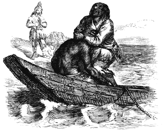 Не могу выразить, как я был растроган таким проявлением сыновней любви в моем друге. Нельзя было без слез смотреть на эту радость грубого дикаря при виде любимого им отца, спасенного от смерти. Но в то же время нельзя было и не смеяться нелепым выходкам, которыми выражались его радость и любовь. Раз двадцать он выскакивал из лодки и снова вскакивал в нее; то он садился подле отца и, распахнув свою куртку, прижимал его голову к своей груди, словно мать ребенка; то принимался гладить и растирать его своими руками. Я посоветовал растереть его ромом, что бедняге очень помогло.
