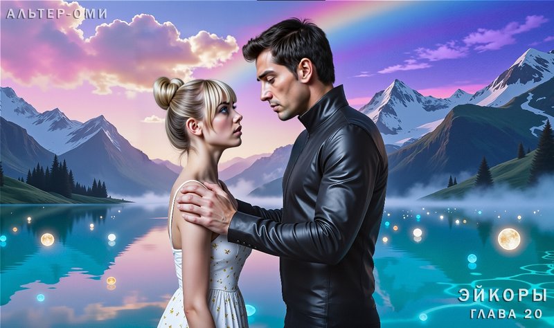Теперь перед ними виднелось голубое озеро в окружении гор. Вода переливалась всеми оттенками бирюзы, а над ней парили светящиеся частицы, создавая волшебную атмосферу. Небо, окрашенное в нежные розовые и золотые оттенки, переливалось всеми цветами радуги.