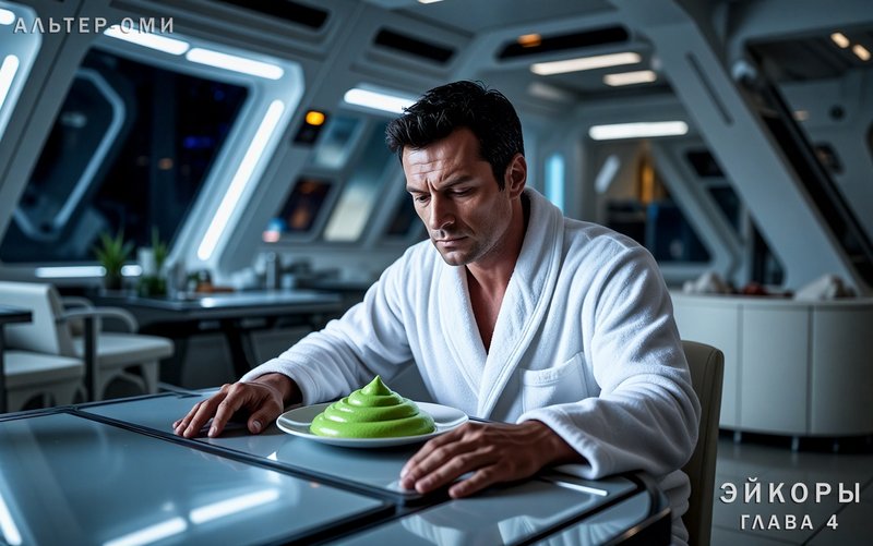 Вокруг всё выглядело идеально — и явно не было похоже на жилище простого человека. Слишком чисто. Слишком правильно. Слишком… Но прежде чем он успел что-то сказать, стол изменился: серая блестящая поверхность сменилась белоснежной столешницей, на которой стояла тарелка с непонятной массой.