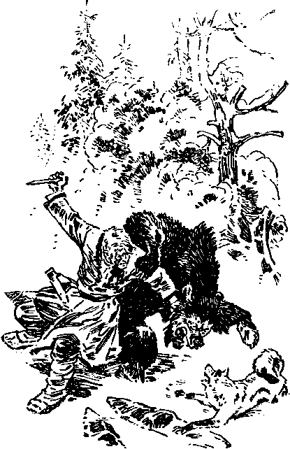 Но тут медведь встал на задние лапы, выпрямился — огромный, лохматый. Раскрыл широкую пасть, заревел страшным голосом, мотнул головой и шаг за шагом пошел прямо на Тимоху. Вот пять шагов осталось, вот три, два... Но тут Серко снова подлетел сзади и зубами вцепился в мохнатый зад зверя. Медведь заревел громче прежнего, присел, обернулся. В это мгновение Тимоха бросился на противника, руками вцепился в его длинную шерсть и повалил зверя на снег. Он занес нож, но медведь сильным ударом задних лап сбросил с себя Тимоху, вывернулся и лапой, с размаху, ударил его по руке. Кровь брызнула из руки у Тимохи, нож выскользнул из кулака и утонул в снегу. Когтистая широкая лапа мелькнула перед глазами. Поддавшись страху, Тимоха двумя руками обхватил голову, защищая лицо. Но тут Серко изловчился и впился зубами в зад зверя, возле самого хвоста. Медведь присел. Тимоха снова кинулся на него, повалил в снег, одной рукой стараясь нащупать нож. Сцепившись друг с другом, медведь и человек копошились на снегу. Сильными руками Тимоха прижимал зверя к земле, но медведь пересилил. Он поднял голову, приподнялся, разинул страшную пасть. Взмахнув огромной лапой, острым, как нож, когтем рванул Тимоху по щеке, возле самого уха. Кровь ручьем хлынула из раны, окрашивая белый снег. Тут Серко сбоку налетел на зверя, но тот одним взмахом лапы отшвырнул собаку в сторону. Серко жалобно завизжал от боли, барахтаясь в глубоком снегу...