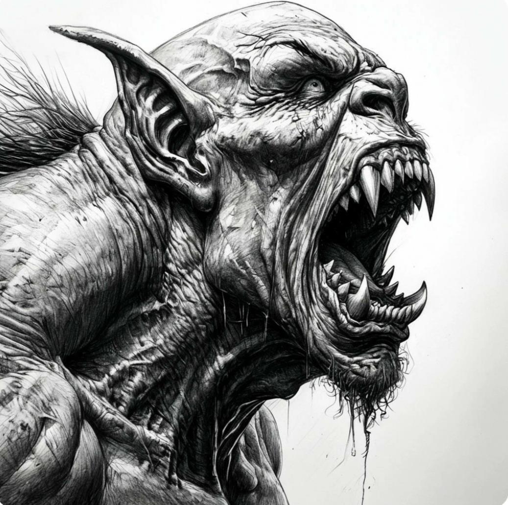 Трупоеды сбавили шаг. Их безобразные, вытянутые лица исказились в смеси настороженности и злобы. Несколько уродцев замерли на грани атаки, но главный — с костяным стержнем, продетым сквозь нос — поднял руку, останавливая сородичей. Вонь от них стояла жуткая: смесь гнилого мяса, немытого тела и чего-то едкого, напоминающего старые бойни.