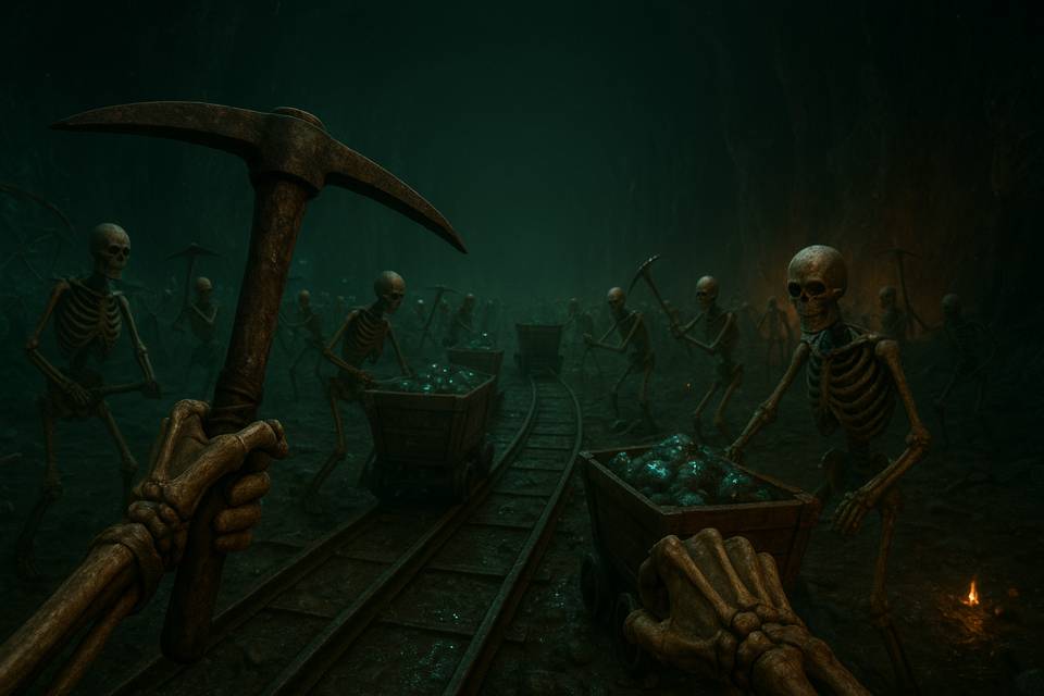 Тем временем другие скелеты вокруг продолжали работу. Все они добывали руду, откалывали куски камней и после сваливали их лопатами в небольшие тележки. Как только она наполнялась, скелет сразу брал её и катил к большой центральной телеге. Она была действительно большая, прямо как самосвал. Хм, «самосвал», да? Странное слово, почему-то оно мне показалось знакомым, но я не мог понять его точного значения, однако почему-то был уверен, что оно сейчас подходило, как никогда.