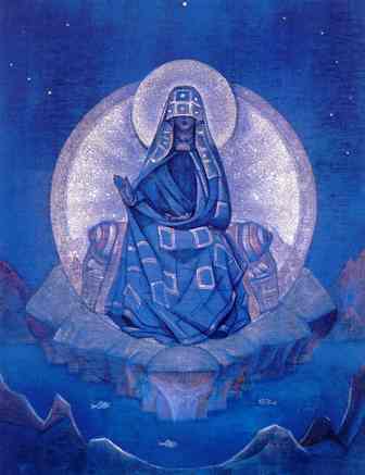 Радж-Раджесвари — Всемогущая Матерь. Тебе поет индус древности и индус наших дней. Тебе женщины приносят золотые цветы, и у ног Твоих освящают плоды, укрепляя ими очаг дома. И, помянув изображение Твое, его опускают в воду, дабы ничье нечистое дыхание не коснулось Красоты Мира. Тебе, Матерь, называют место на Белой Горе, никем не превзойденное. Ведь там встанешь, когда придет час крайней нужды, когда поднимешь Десницу Твою во спасение мира, и, окружася всеми вихрями и всем светом, станешь, как столб пространства, призывая все силы далеких миров.