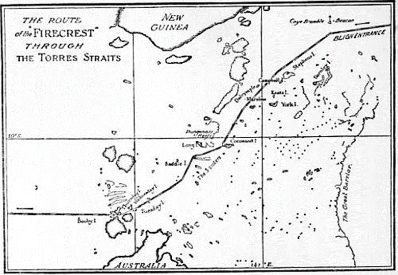Поверхность Арафурского моря была покрыта своего рода красной пылью, которую уже замечали и отмечали капитан Кук и Чарльз Дарвин. Бесчисленные маленькие морские змеи, сверкающие яркими цветами, часто выныривали на поверхность. Ночью вода была удивительно фосфоресцирующей, и «Файркрест» оставлял за собой длинный светящийся след.