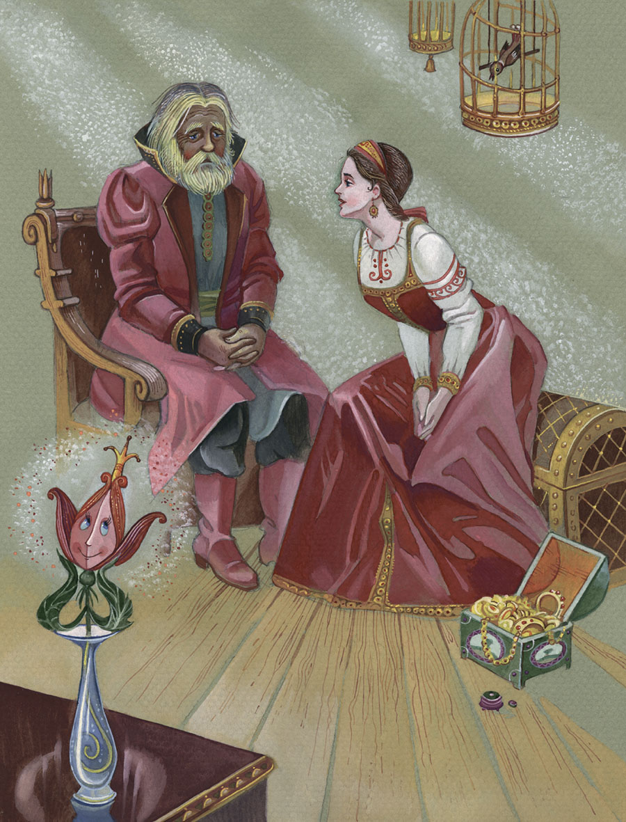 Залился слезами честной купец, обнял он свою меньшую дочь, любимую, и говорит ей таковые слова: