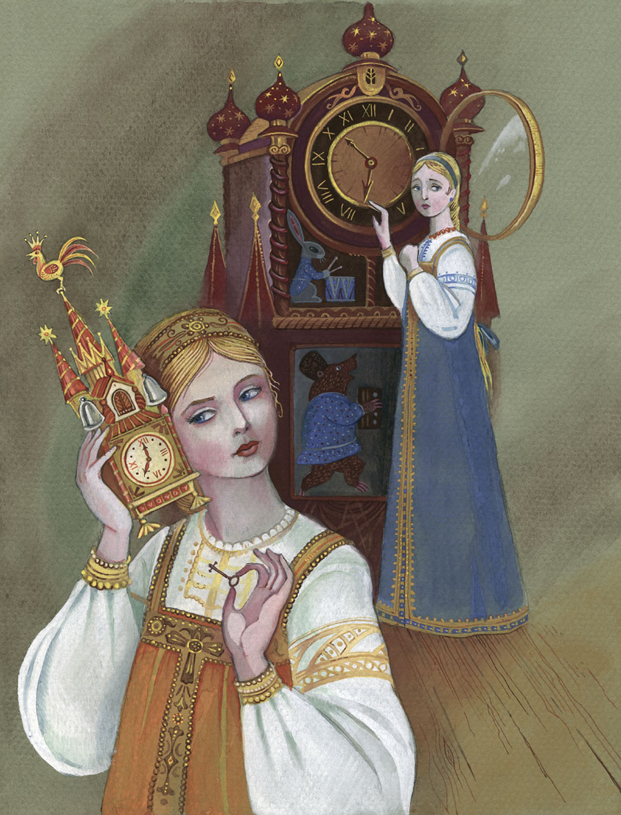 И отец её, честной купец, похвалил её за такие речи хорошие, и было положено, чтобы до срока ровно за час воротилась к зверю лесному, чуду морскому, дочь хорошая, пригожая, меньшая, любимая. А сёстрам то в досаду было, и задумали они дело хитрое, дело хитрое и недоброе: взяли они да все часы в доме целым часом назад поставили, и не ведал того честной купец и вся его прислуга верная, челядь дворовая.