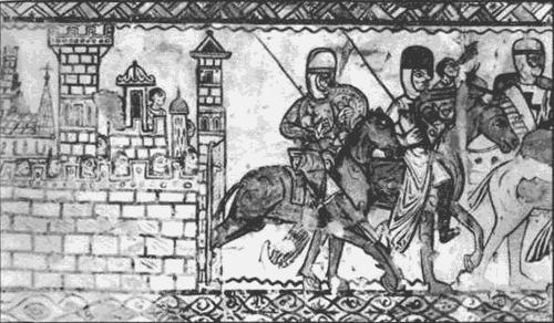 Рис. 16. Крестоносцы выезжают из ворот замка, чтобы вступить в битву с сарацинами. Фреска в часовне тамплиеров (1170–1180). Крессаке, деп. Шаранта [41]