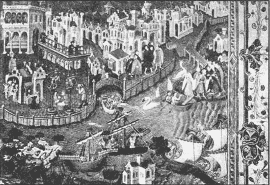 Рис. 17. Венеция – ворота на Восток. Миниатюра к оксфордской рукописи (около 1400 г.) сочинения Марко Поло изображает Венецию с ее торговыми судами, купеческой аристократией, нарядными домами на Пьяццетте. Слева на площади – колонна со львом св. Марка. [45]