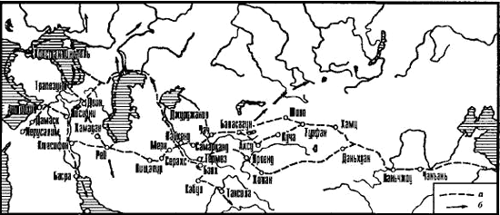 И ныне привел караван я.Гружен Коврами, одеждами, тканями он.Алмазы везем, благовонья, венцы —Ведь здесь покупатели, мы ж – продавцы. [66] ФирдоусиОсновная магистраль протянулась от Средиземного моря через Нисибин, Хамадан, Рей, Нишапур, Мерв, Бухару, Самарканд, Чач, Тараз (Талас), Баласагун, оазисы Восточного Туркестана к танской столице Чанъань (рис. 20). Самые трудные участки трассы старательно поддерживали в хорошем состоянии. В солончаковой пустыне Центрального Ирана через каждые 15 км встречалась куполообразная постройка над прудом с водой. Для ориентировки служили деревянные шесты или похожие на минареты башни. Через реки перекидывали изогнутые дугой мосты на стрельчатых арках. «Если двигаться прямым путем, то считают, что от Красного моря до Китая около 200 станций, или дневных переходов. Отдельные расстояния следующие: от Красного моря через пустыню до Ирака около 2 месяцев, из Ирака до Балха около 2 месяцев, от Балха до границ ислама в стране Фергане немногим более 20 переходов, от Ферганы через Страну карлуков до домов Тагазгаза немногим более 1 месяца, от жителей Тагазгаза до моря, омывающего берега Китая, около 2 месяцев» (Абу-л-Фида, XIV в.). [67] Срок, указанный этим поздним географом, можно считать рекордом скорости. Практически путешествие в Китай растягивалось года на три ввиду длительных остановок на отдых, зимовок, ожиданий благоприятной погоды и т. д. По пути лежали главные торгово-ремесленные города Востока, центры притяжения людей и товаров.