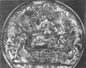 В сасанидской и среднеазиатской торевтике [83] вакхические мотивы – Вакх с пантерой, его победоносное шествие, Силен с винным мехом, танцы менад, виноградные лозы – получают развитие благодаря знакомству с так называемым византийским антиком (рис 24) Это серебряные сосуды со сценами из античной мифологии – произведения ювелиров эпохи Юстиниана I и его преемников Как и придворные стихотворцы, мастера по металлу ориентировались на академическое подражание древним образцам. Они отразили вкусы высшего общества Восточной Римской империи, которое считало себя наследником языческих цезарей Рима. Перевозимые по дорогам «шелковой дипломатии» (с 568 по 576 г Среднюю Азию посетило семь византийских посольств) произведения торевтов Рума в короткий срок достигали Согда и Ферганы, оседая в сокровищницах местных владетелей. Недалеко от Кунгура на Урале найдено блюдо времени Юстиниана I со сценой посещения Венерой Анхиза – чье-то воспоминание о путешествии на Запад или просто дорогая вещь, купленная согдийским любителем редкостей. На блюде вырезана согдийская надпись с именем бухарского государя раннесредневекового государства Уструшана.