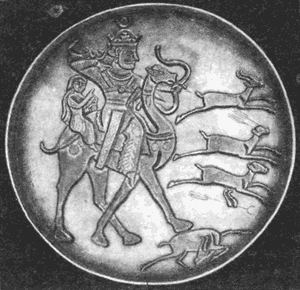 Рис. 27. На иранском серебряном блюде Vile – эпический сюжет, распространенный в искусстве царевич Баграм Тур, он же – сасанидскии царь Варахран V (421–439), охотится на газелей в сопровождении рабыни Азаде.