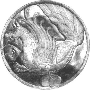 Рис. 28. Центральный медальон серебряного блюда. Иран, VIII в. в зороастрийских трактатах собака-птица Сенмурв предстает как благожелательное существо, оберегающее от злых сил. Блюдо найдено на берегу Камы (Вятская губ) Гос. Эрмитаж.