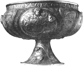 Рис. 30. Византийская серебряная с позолотой чаша с изображением сцен из греческого героического эпоса. XII в Найдена близ села Виль-горт в Приуралье. Гос. Эрмитаж.